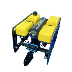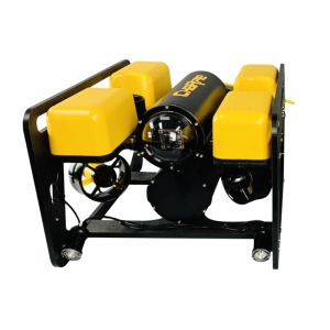 The submersible includes thrusters, an electronics pod (with gimbal camera), LED lights, battery pod, buoyancy blocks (yellow part), and a shock resistant frame for protection. While standard configurations meet most operational needs, the system can be customized or upgraded. For example, more powerful thrusters for bigger payloads, larger battery packs for extended missions and additional cameras or sensors.
