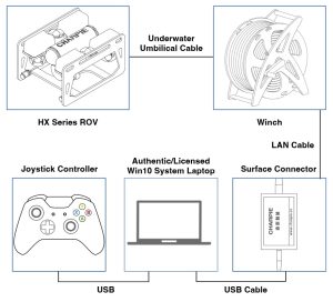 An underwater ROV system typically comprises the five major components below: the topside control console, the submersible, the communication and power system, auxiliary tools and sensors, and user-defined modules.