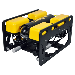 The submersible includes thrusters, an electronics pod (with gimbal camera), LED lights, battery pod, buoyancy blocks (yellow part), and a shock resistant frame for protection. While standard configurations meet most operational needs, the system can be customized or upgraded. For example, more powerful thrusters for bigger payloads, larger battery packs for extended missions and additional cameras or sensors.